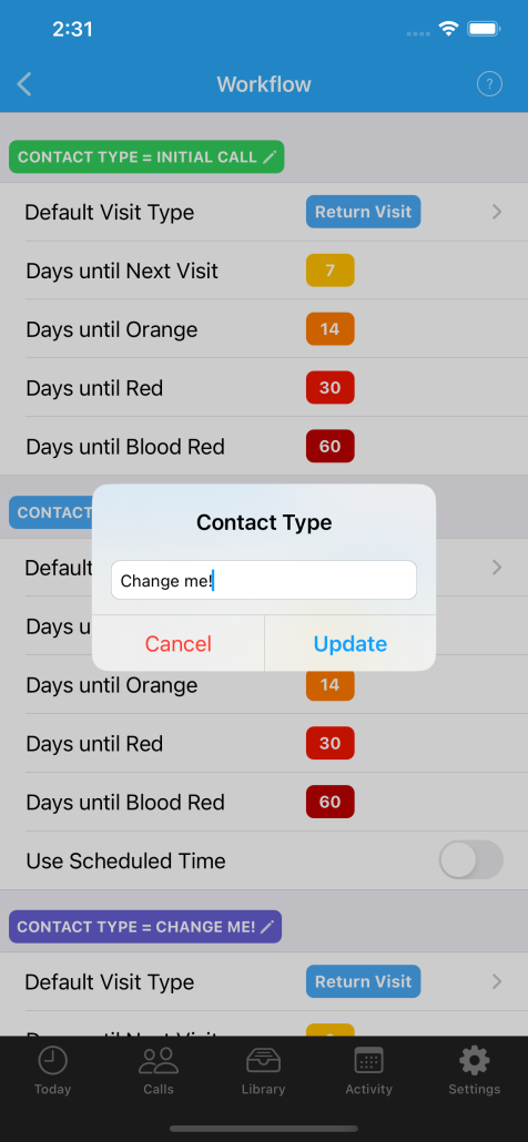 While in this area I also renamed “First Call” Visit Type (and Contact Type) to “Initial Call” to better reflect the terminology we use in the Workbook.
